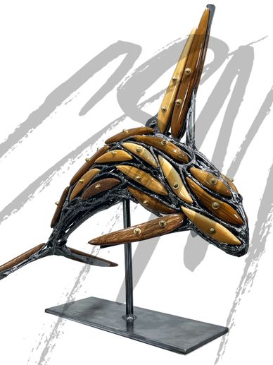 Captures the motion and force of a whale mid-breach, crafted from steel and cedar wood.